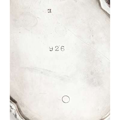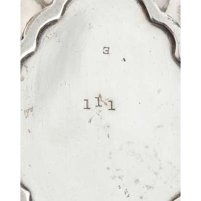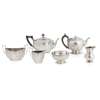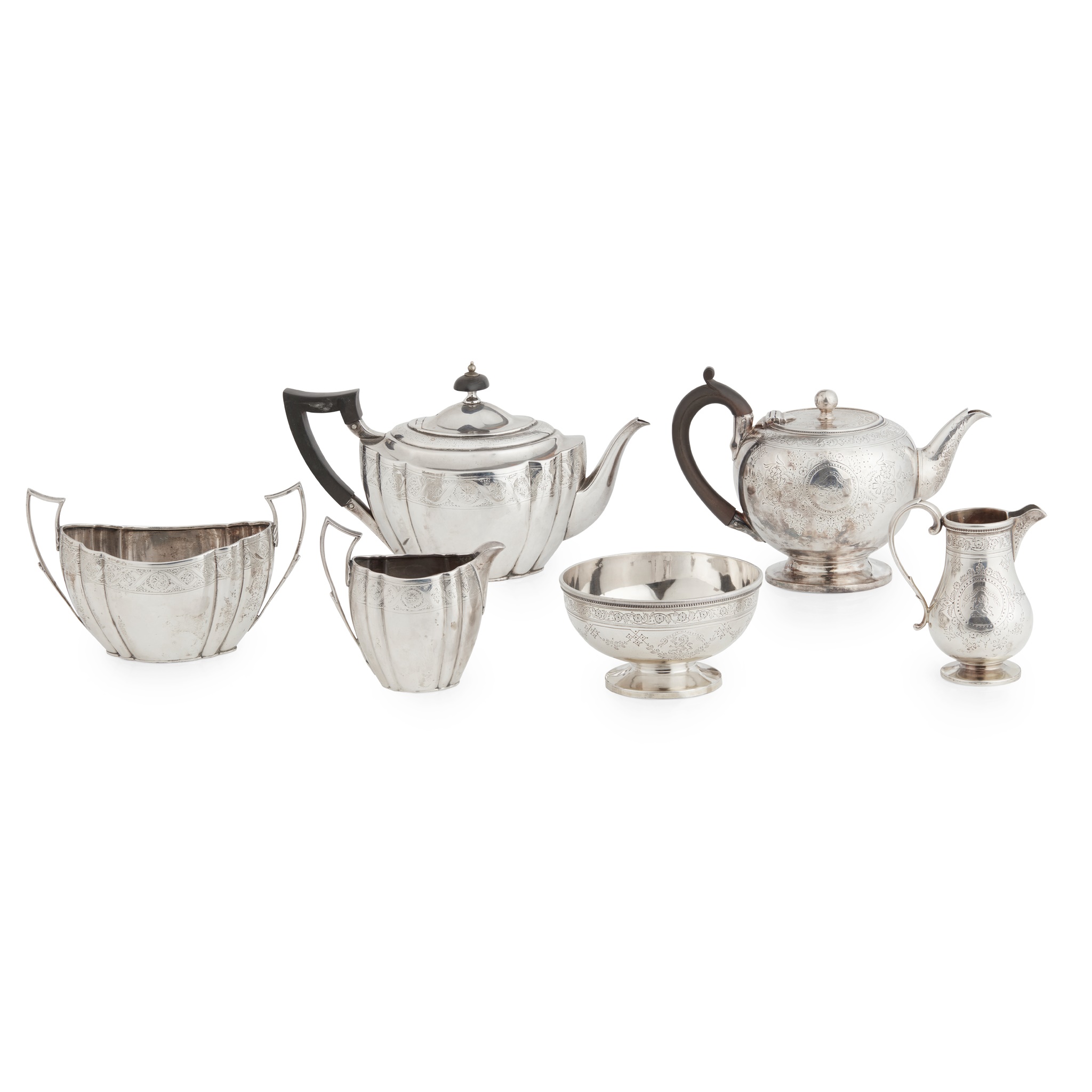 The Barnards, London 1889, comprising teapot, twin-handled sugar bowl and cream jug, each of shaped oval outline with bright engraved borders; together with another three-piece tea service, with maker’s mark Chawner & Co. (George Adams), London 1874, comprising, a teapot, sugar bowl and cream jug, each of circular outline, bright engraved decoration with foliate scroll borders and swags, each piece crested and monogrammed, the whole loosely in mid 18th-Century Scottish style