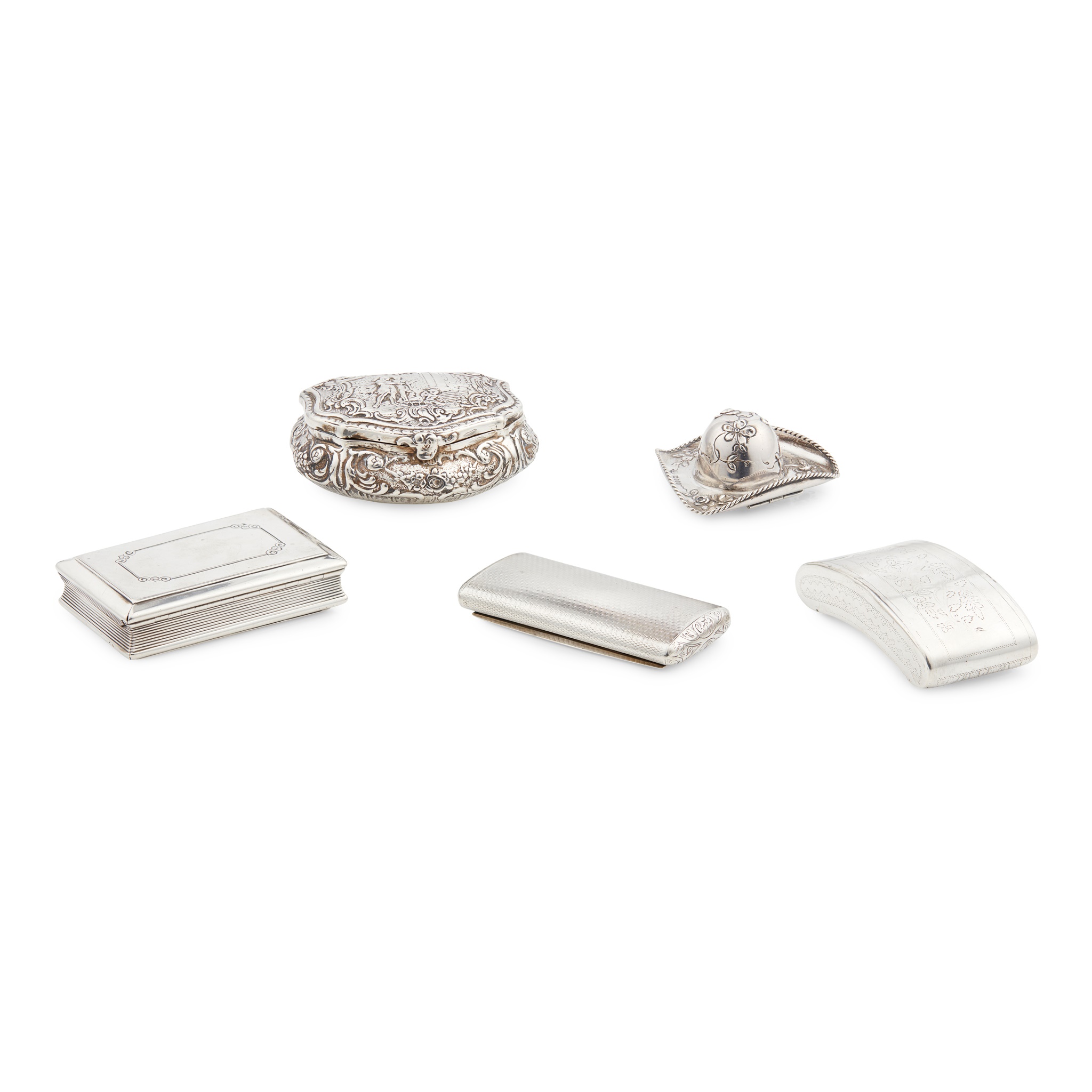 to include, a Dutch-style box, Edwin Thompson Bryant, London 1881, with all-over embossed scroll decoration, a pastoral scene to the lid; together with a Dutch import novelty box, London 1902, modelled as a hat; two Victorian boxes with engine-turned decoration and a George III curved box, London 1808 with foliate detail