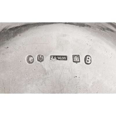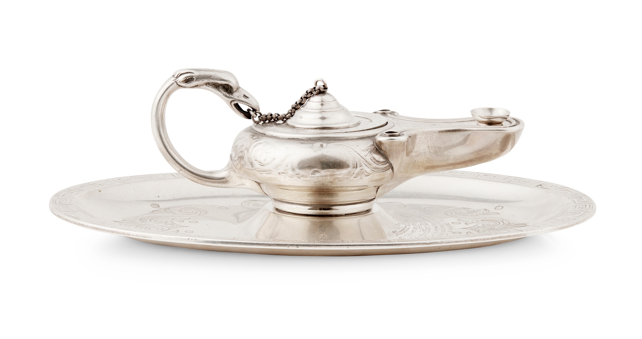 James and Walter Marshall, Edinburgh 1858, the base of oval outline with Greek-key engraved border, presentation engraving to the centre 'Presented to ALEXANDER DOWELL Esq/ ON THE OCCASSION OF HIS MARRIAGE/ BY THE/ EMPLOYEES OF MESSRS DOWELLS & LYON... 1861,' the inkwell modelled as a lamp with mythical creature handle