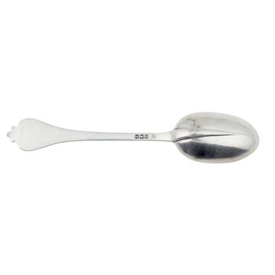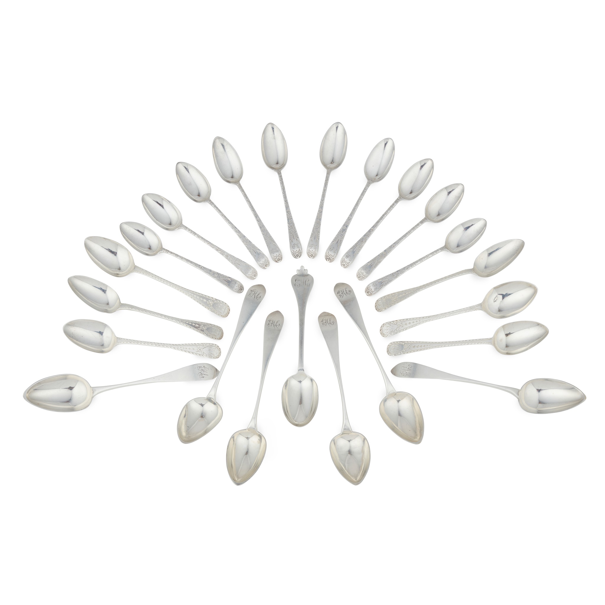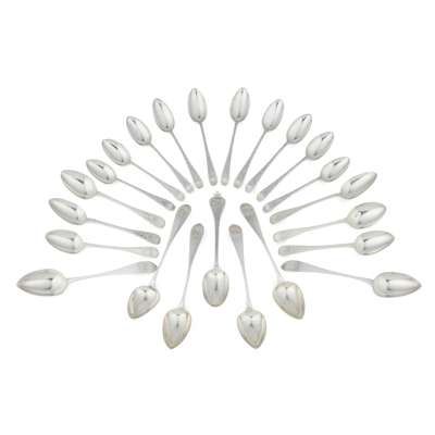Robert Keay, marked double-headed eagle, RK twice, of Pointed Old English pattern, initials engraved to terminal; together with six matched teaspoons, mainly Matthew West, Dublin, of single struck Bright-cut feather edge pattern and a set of ten coffee spoons, Robert Scott, Glasgow 1880, of double struck Old English pattern with heavily engraved floral decoration; together with a modern trefid dessert spoon, Wakeley & Wheeler, London 1917, with initials engraved to terminal