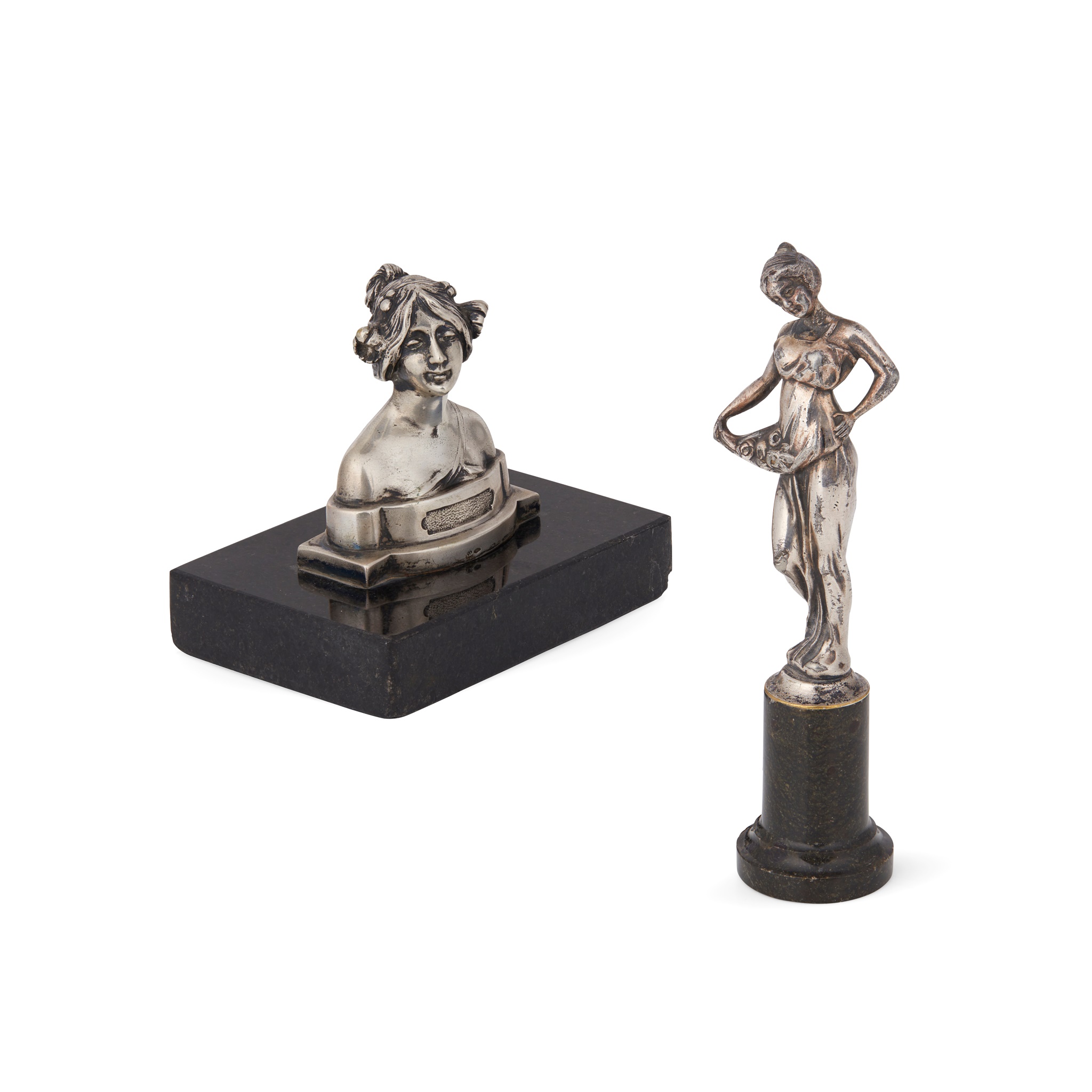 SS, indistinct mark, a half-bust study of a young lady with long hair tied up, all on a polished base; together with another standing plated figure of Spring, standing full length on a circular section hardstone plinth