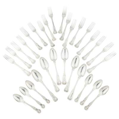 London, various makers and dates, primarily Victorian, comprising, six tablespoons, six dessert spoons and eighteen table forks, all of double-struck King's pattern
