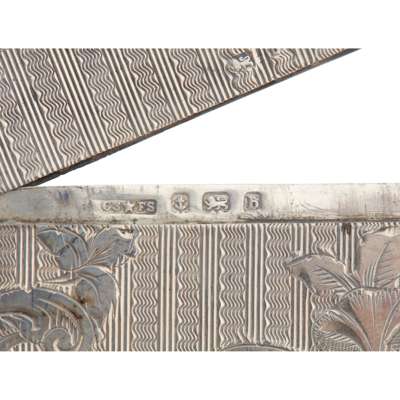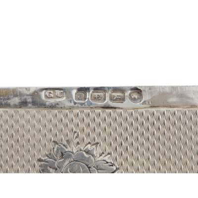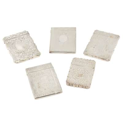 to include, FM, Birmingham 1868, of moulded rectangular outline, initial engraved to centre in an engraved scroll and foliate background; George Unite, Birmingham 1875, with engine turned decoration and a vacant oval cartouche to centre; Cornelius Desormeaux Saunders & James Francis Hollings Shepherd, Birmingham 1901, engine turned and scroll decoration; together with a later card case, Birmingham 1915, with chased foliate scroll decoration and an unmarked Indian style card case