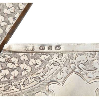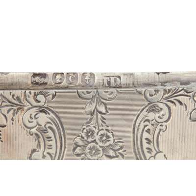 Thomas Dones, Birmingham 1851, moulded rectangular outline, with all over foliate and floral decoration engraved initials to centre; Aston & son, Birmingham 1861, engine turned decoration, engraved initials to centre; Joseph Gloster, Birmingham 1897, moulded rectangular outline, with all over foliate and floral decoration; together with a later card case, William Neale & Son, Birmingham 1914, with engine turned decoration and a Greek-key border