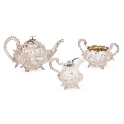 John & Henry Lias, London 1837, comprising a teapot, twin-handled sugar basin and a milk jug, all of baluster lobed form, each panel chased with floral decoration, the cartouche with a chased bird, acanthus capped S-scroll handles, the teapot with a budding finial and ornately decorated spout, ivory insulators to handle, each raised on four scroll and shell bracket feet