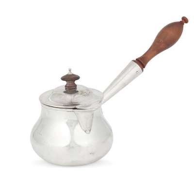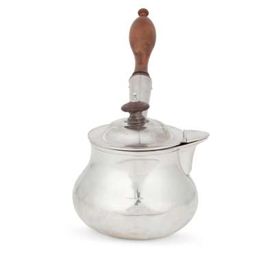 possibly Charles Reily & George Storer, London circa 1830, the baluster body with sparrow beak spout, with turned wood handle, socket set to body; together with a later lid, Hamilton & Inches, Edinburgh 1902, with knopped finial