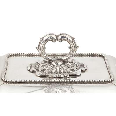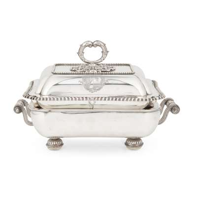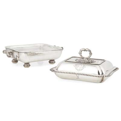 Benjamin Smith II & Benjamin Smith III, London 1817 (to cover and dish), of moulded rectangular outline with a gadrooned border, the domed cover with a gadrooned border to inside, a beaded border to top above engraved marital armorials to either side, with an acanthus clasped handle, the silver-plated liner and base of plain rounded rectangular form, with scroll handles and raised on four ball feet with gadrooned detail and ivory bases