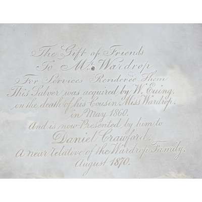 Peter, Anne & William Bateman, London 1805, each of circular outline with a gadrooned border, engraved foliate decoration to the border of dish with initials and crest engraved to centre, presentation inscription engraved to the underside, each raised on three bracket feet