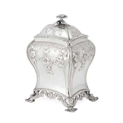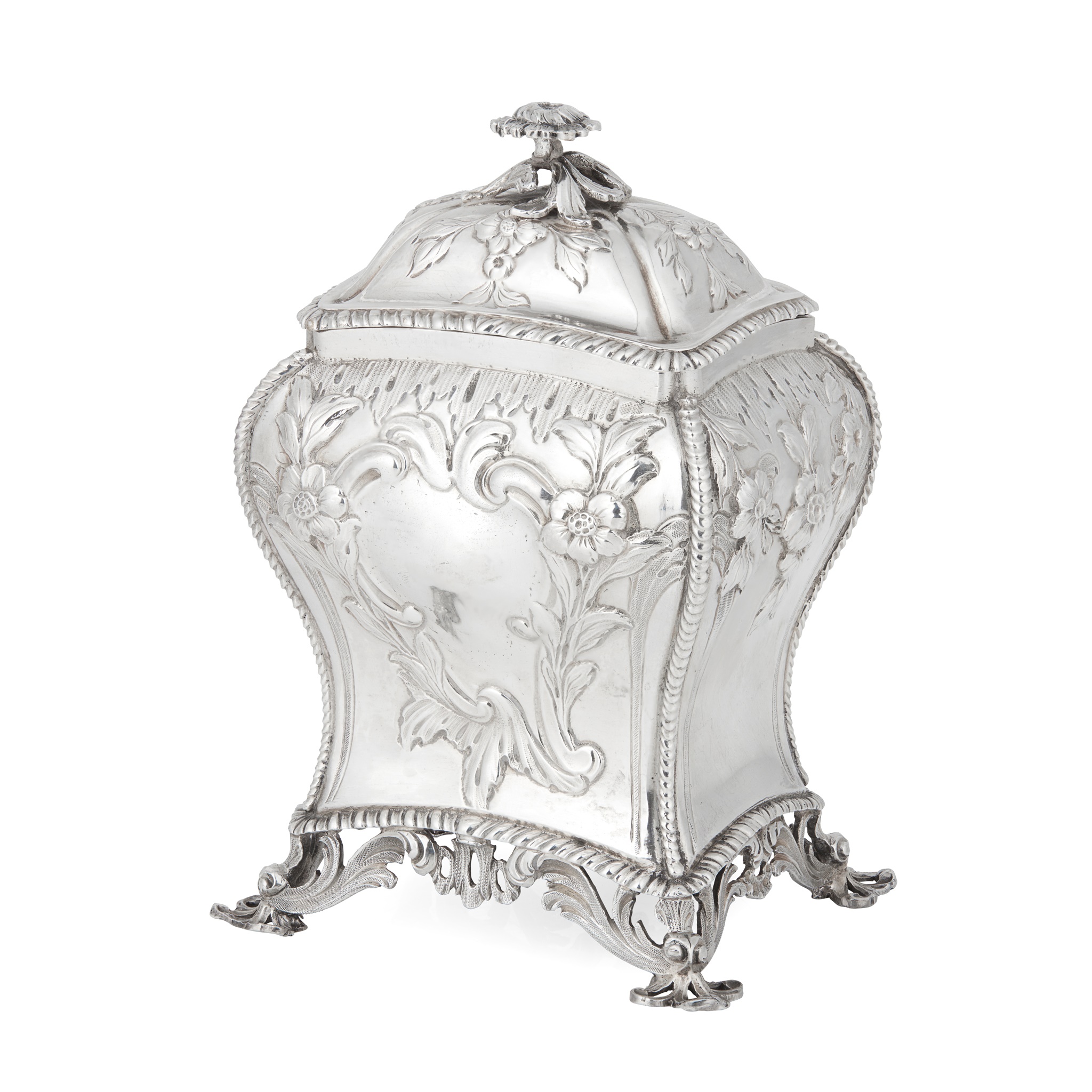 Henry Bailey, London 1768, of bombé form with rope-twist borders and floral scroll cartouche to the body, raised on four acanthus bracket feet, the pull off lid with budding finial and scroll floral detail