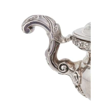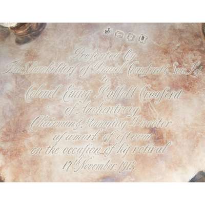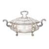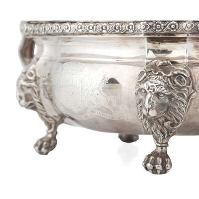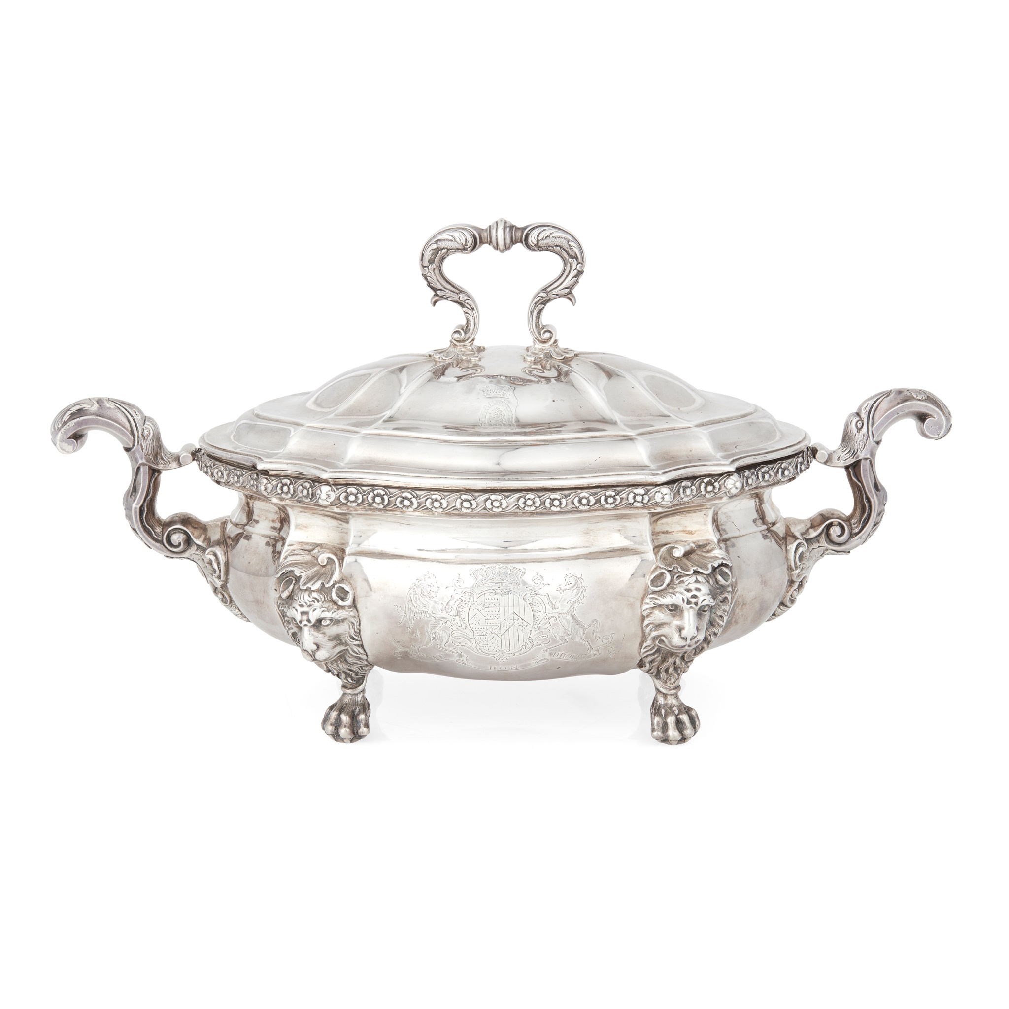 unregistered maker's mark, attributed to Thomas Gilpin, London 1755, of moulded oval outline, cast floral border to body, with engraved armorials to either side, the handles each modelled as a bird's beak to an acanthus scroll, raised on four lion mask clasped legs to paw and ball feet, the underside engraved with a presentation inscription 'by the Shareholders of Daniel Crawford & son Ld./ to/ Colonel Ewing Russell Crawford... 17th November 1913', the pull-off lid engraved with a crest and Earl's coronet to either side, the fixed handle of scroll form