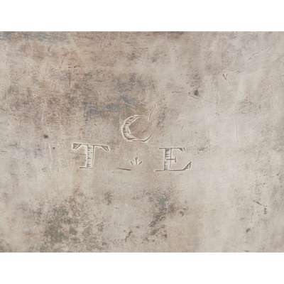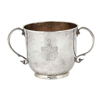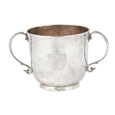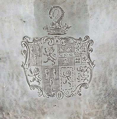 Nathaniel Lock, London 1708, of traditional form, the S-scroll handles with beaded decoration, engraved armorials to one side of body, prick engraved C/T.E to the other side, raised on a circular foot