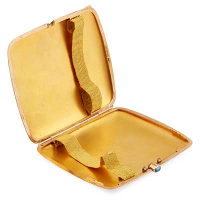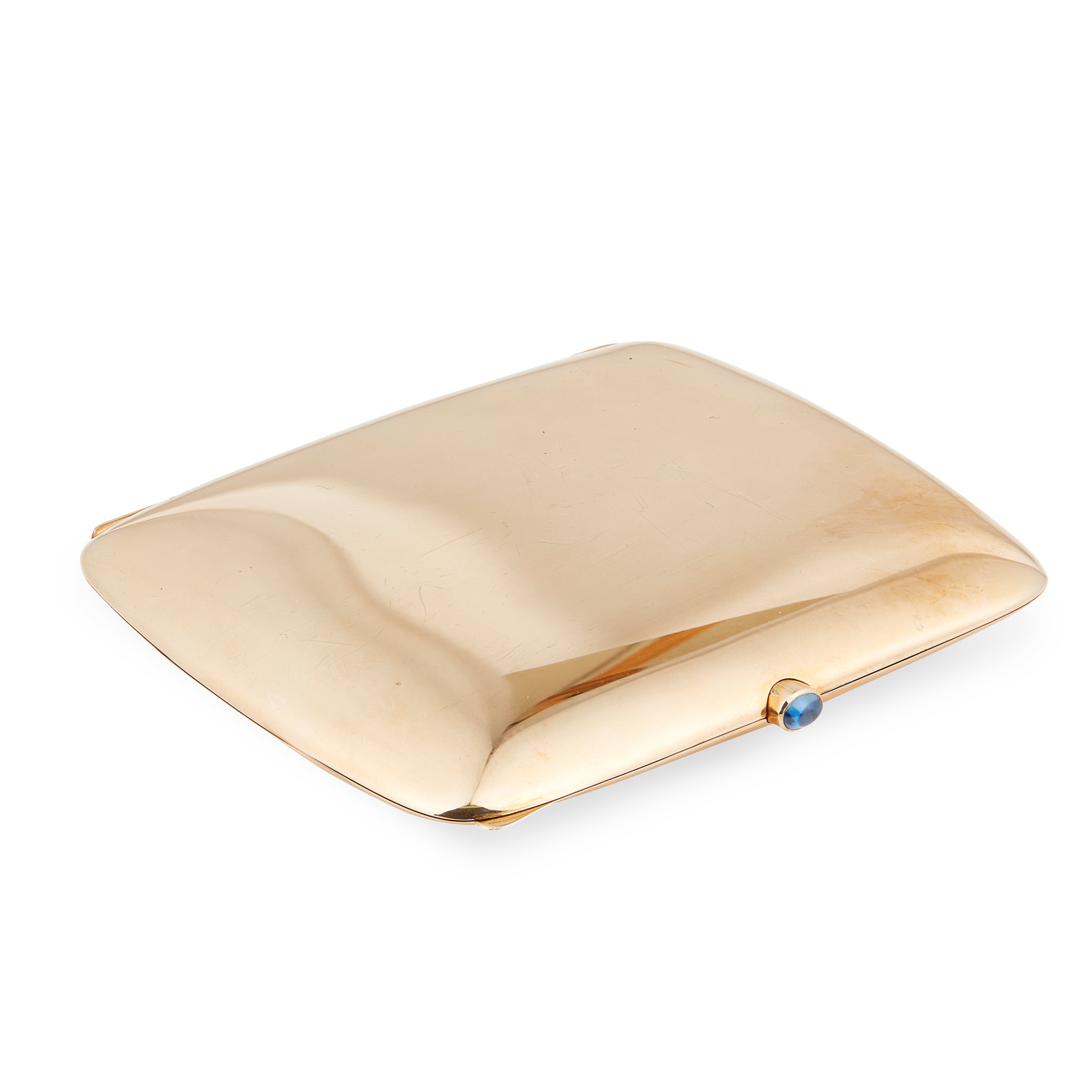 stamped 585 Bachruch, of curved rectangular outline, the plain polished case with a sapphire cabochon thumb piece