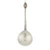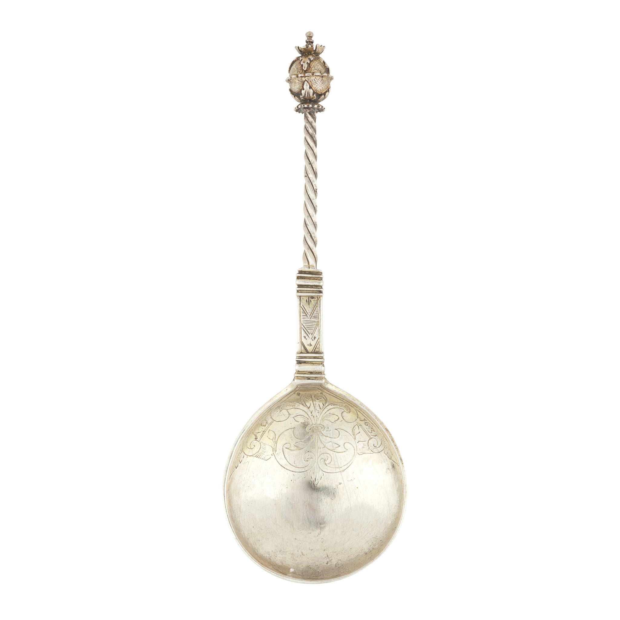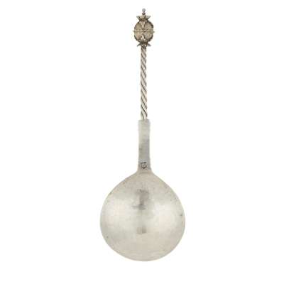 Jonas Andersen, c.1631, the fancy ball knop with clasping acanthus detail and reeded knop, above a two stage wrythen and flat section stem, the circular bowl with parcel gilded and engraved foliate section, marked to base of stem