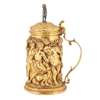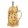 Elkington Mason & Co. of Birmingham circa 1860, of cylindrical form, with S-scroll handle, the hinged lid with baby Bacchus finial, after a 17th-century ivory tankard with silver mounts, representing the drunken Silenus, scroll handle and baby Bacchus finial, the underside inscribed 'From the original ivory in the possession of Henry Bedford Esqr, executed by Elkington Mason & Co. 1348'