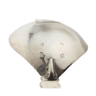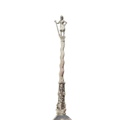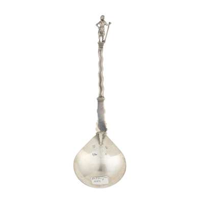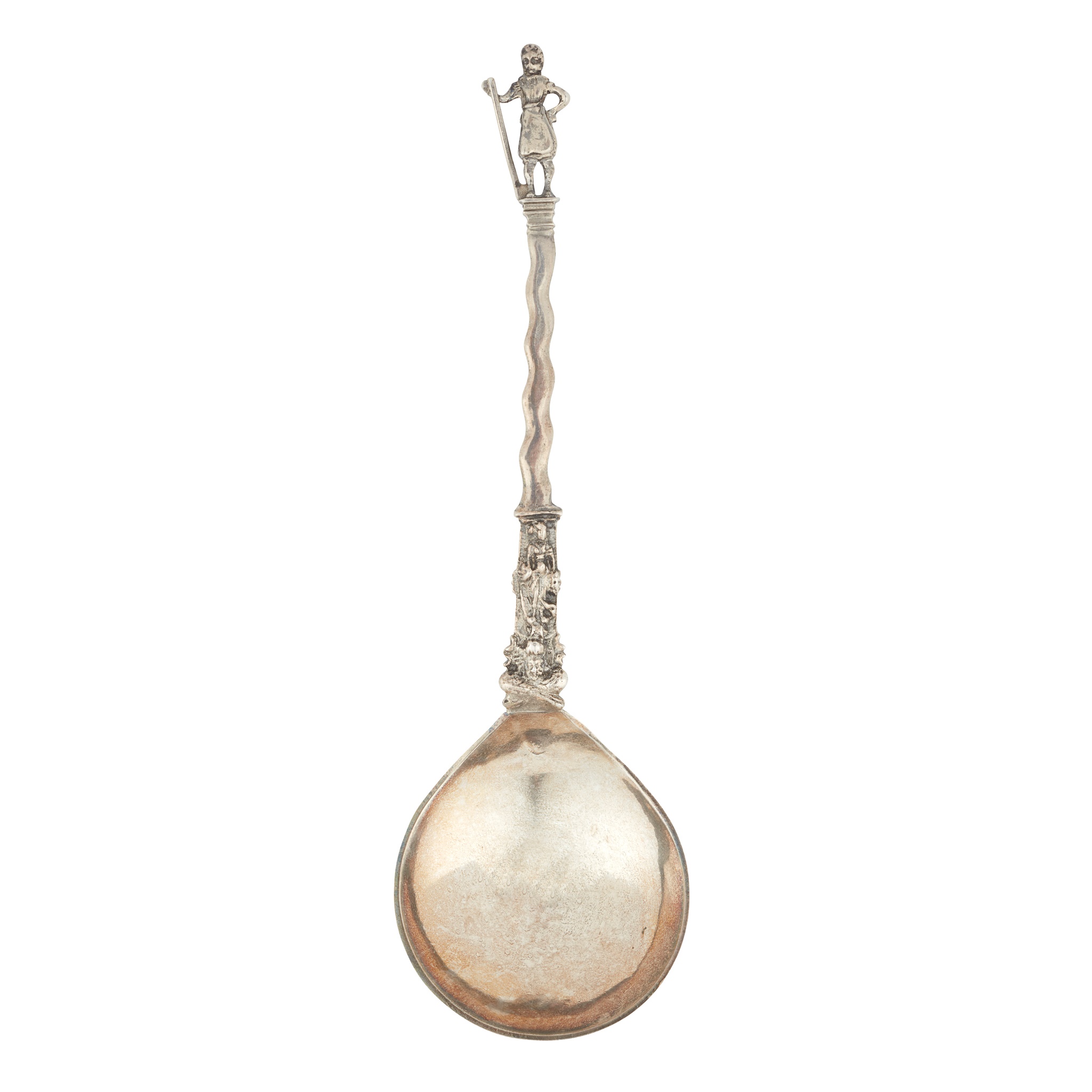 Enkhuizen, 1684, the cast figural finial of a figure holding a staff, above a wavy flat section stem and lower cast figure, above a squat ovoid bowl with simple V-shaped rat tail to reverse, marked flanking rat tail to reverse of bowl