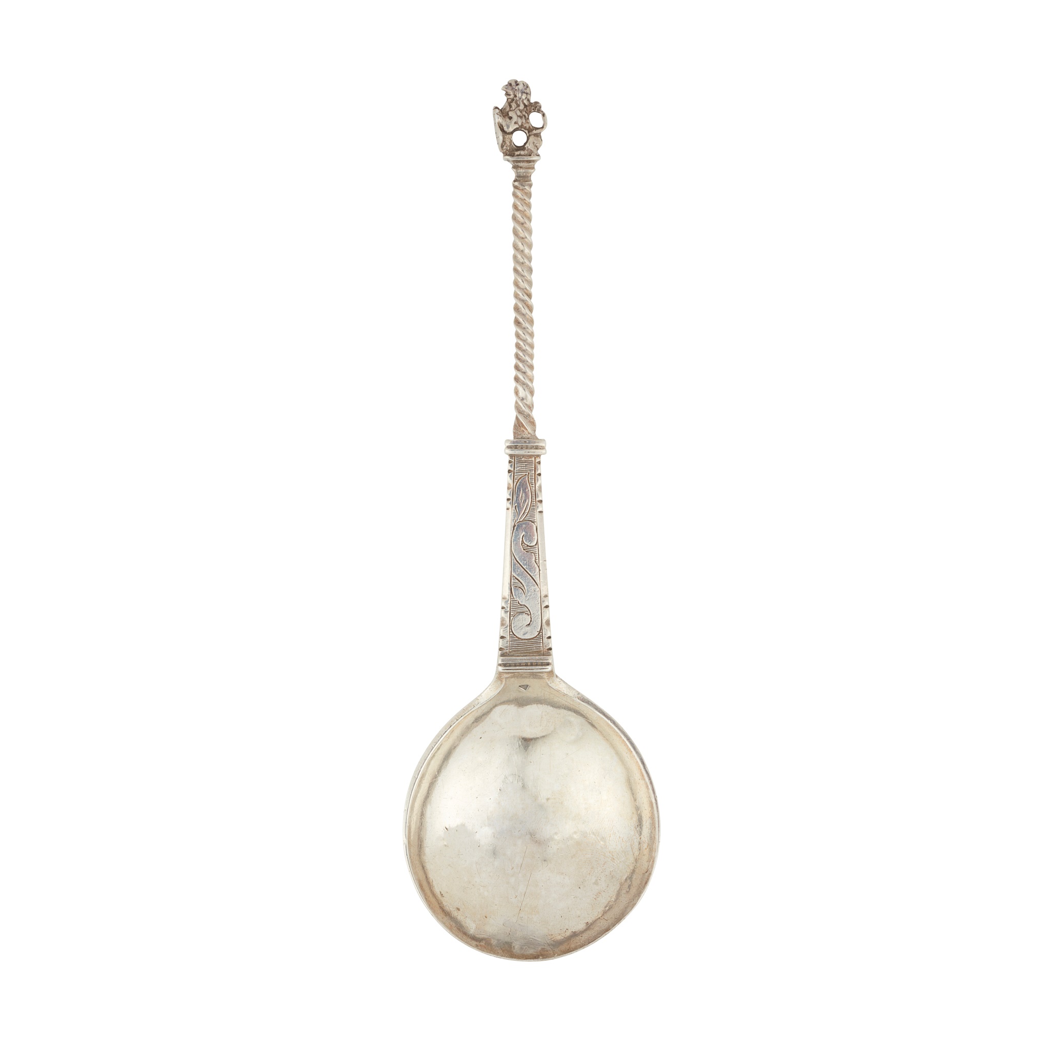 maker unknown, Hoorn, 1660, the cast finial of a side facing lion seated holding a heraldic shield, above a two stage wrythen and flat section stem, foliate engraved lower section, circular bowl, with assay scrape and marks to upper section of reverse