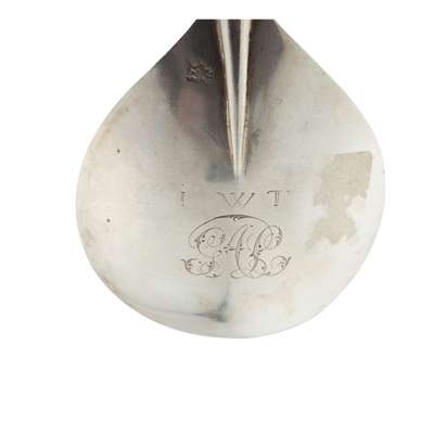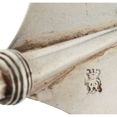 maker unknown, Leeuwarden, c. 1700, the fruiting bud finials above a reeded collar and slight flared stem, with reeded collar join with ovoid bowl with elongated rat tail, marked to shoulder
