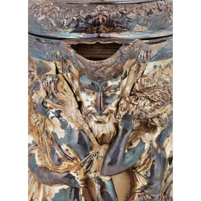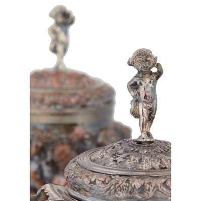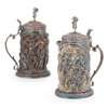 each of cylindrical form, with S-scroll handle, the hinged lid with baby Bacchus finial, after a 17th-Century ivory tankard with silver mounts, representing the drunken Silenus, scroll handle and baby Bacchus finial, the underside inscribed 'From the original ivory in the possession of Henry Bedford Esqr' HB 357 and plain to the underside of the other