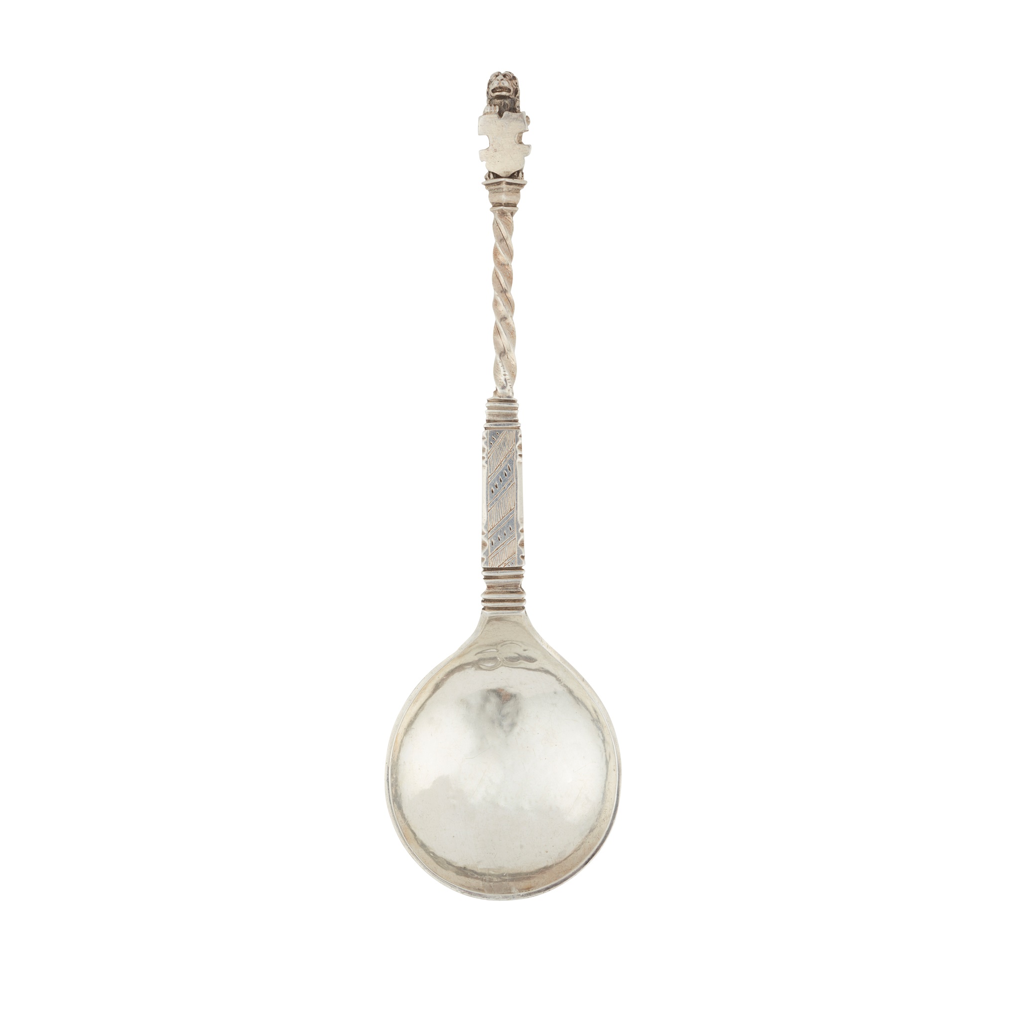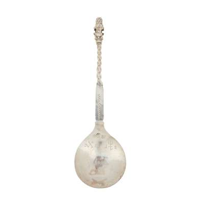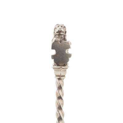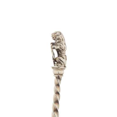 Paulus Sakes (active 1636-75), Dokkum, 1647, the cast finial of a seated lion holding a vacant heraldic shield, on a tapered plinth above a two stage wrythen and flat section stem, cross hatched and engraved decoration above linear border at join with circular bowl, engraved to the reverse with initials ‘DH’ and ‘IB’ each with tradesman’s symbol between, marked to upper area of bowl