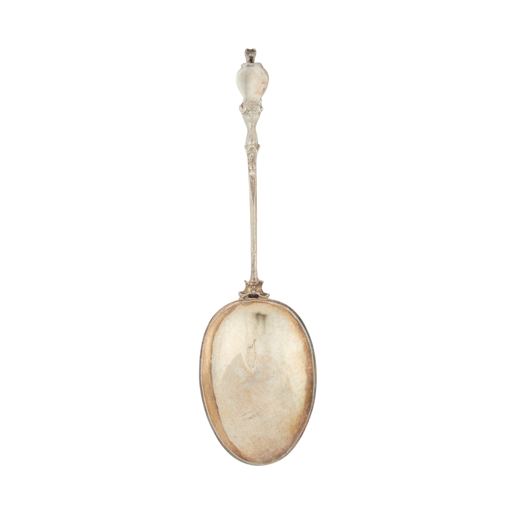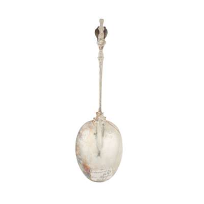Jan Albertus Ketel, Leeuwarden, 1687, the terminal formed as a seated lion holding a large vacant shield, the stem with wasted knop with acanthus detail above a slender stem, with scrolling detail to join with egg shaped bowl, with short rat tail to reverse, assay scrape and marks to shoulder