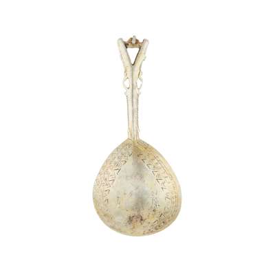 maker unknown, Lappland, the open triangular terminal with applied ring to top and open panels to side, above a short engraved stem and egg shaped bowl, with profusely engraved border and lattice work panel to centre, unmarked