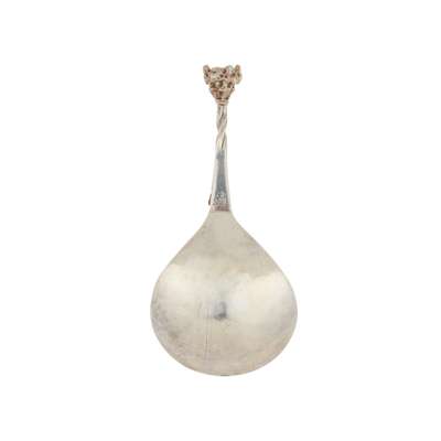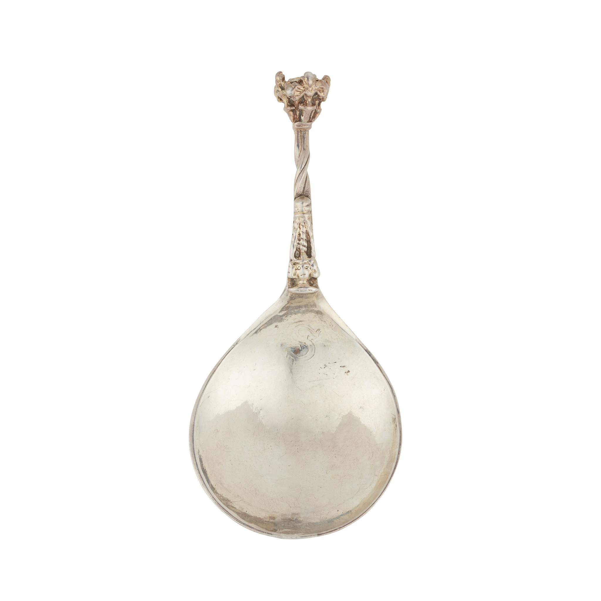 maker unknown, c.1600, the four sided terminal with stylised foliate decoration above a wrythen and cast short stem and plain ovoid bowl, marks to base of stem