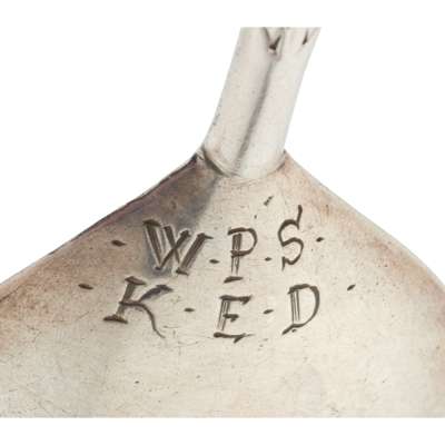 maker’s mark, an eagle, unattributed c.1630, the flat stem with shaped trefoil terminal, chased with trailing foliage to tubular lower section with acanthus detail, the ovoid bowl engraved to reverse with initials WPS / KED