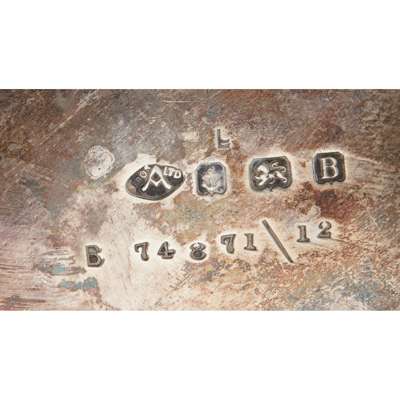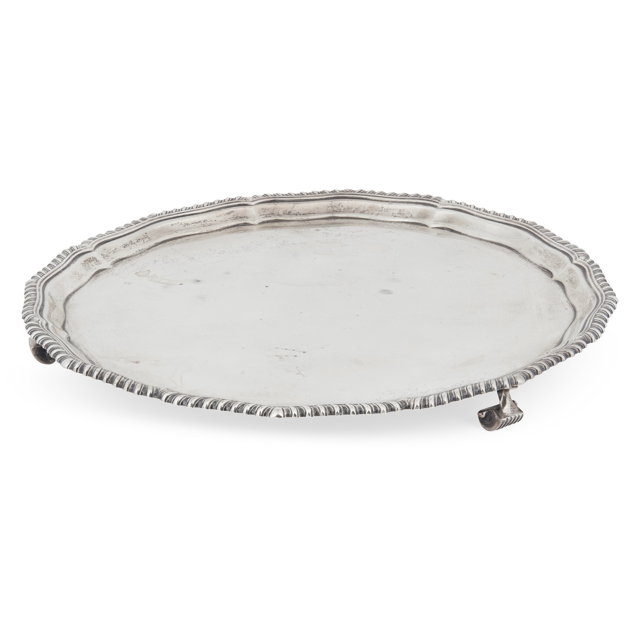 Adie Brothers Ltd, Birmingham 1926, of circular outline with gadrooned border, raised on three scroll feet