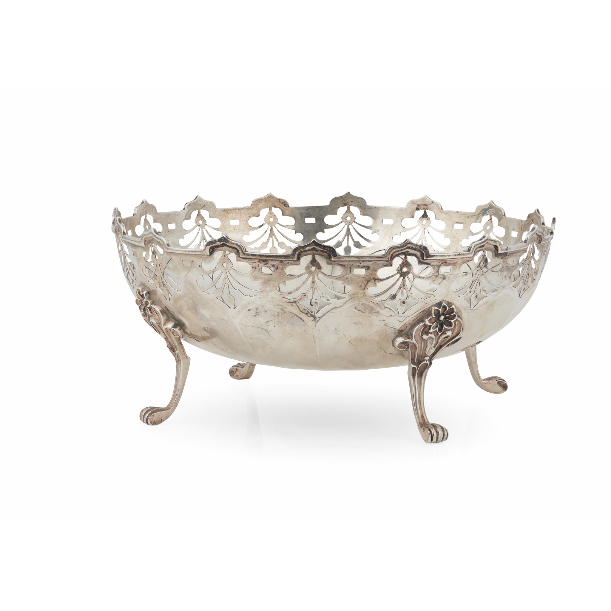 Docker & Burn Ltd, Birmingham 1923, of hemispherical form with a pierced border and lobed body, raised on four cast floral capped legs with paw feet