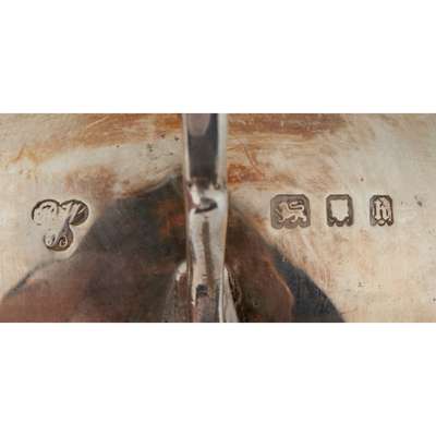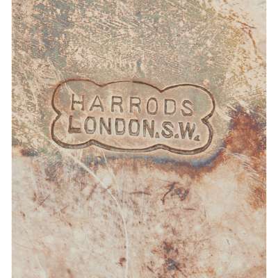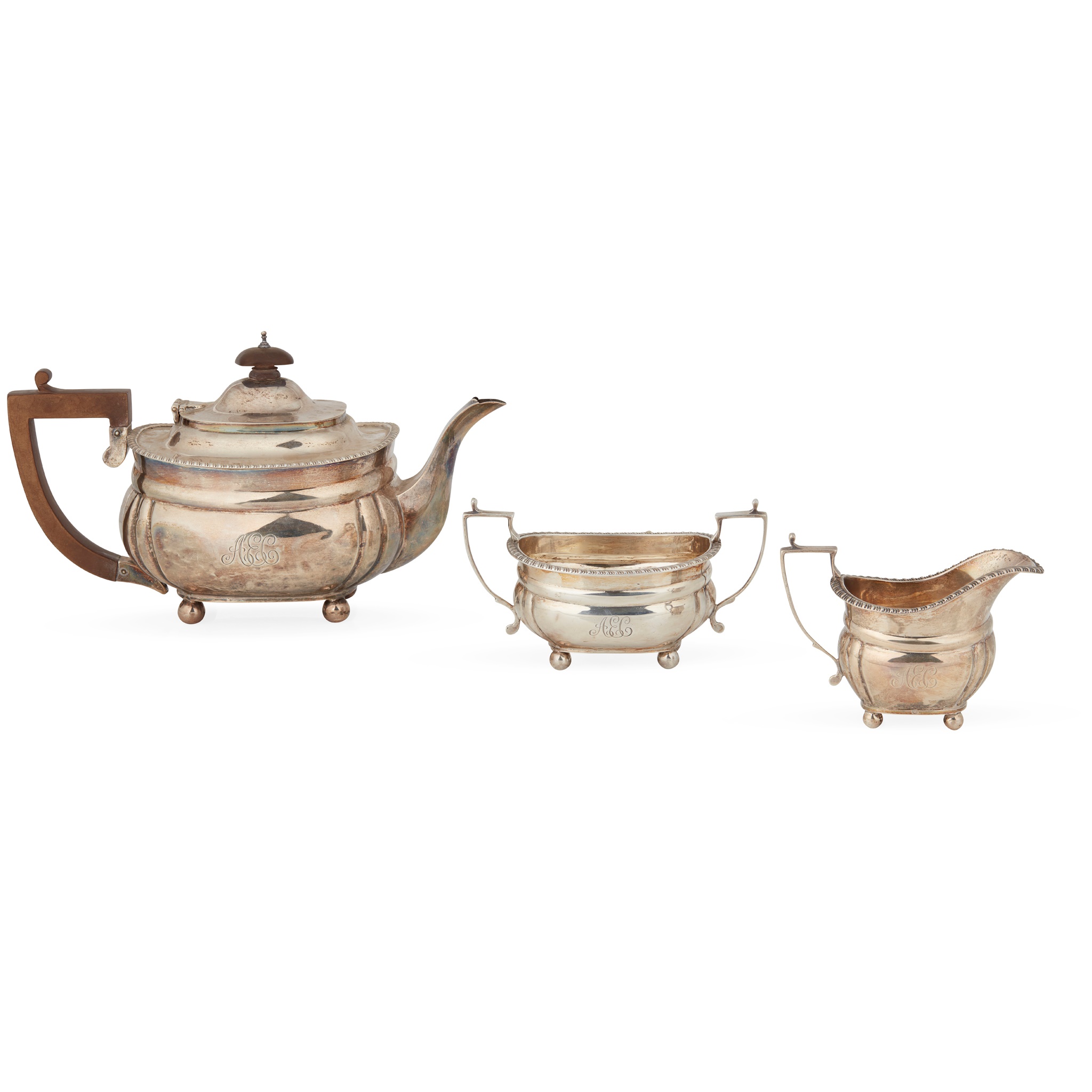 Harrods Ltd, London 1923, comprising a teapot, twin handled sugar basin and a milk jug, all of oval outline, with panelled sides, engraved italic initials, gadrooned border, and angular handles, each raised on four ball feet