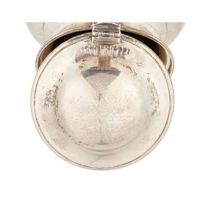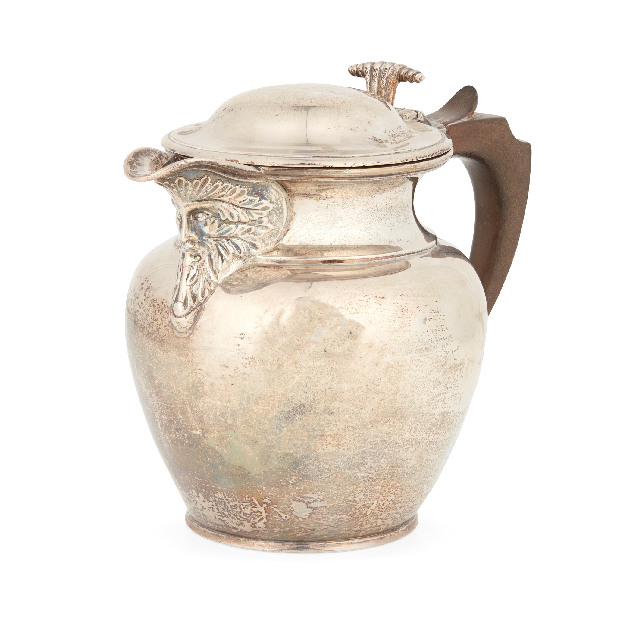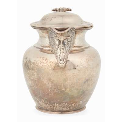 Elkington & Co Ltd, Birmingham 1911, of squat baluster outline, Bacchus mask to the spout, the slightly domed lid with engraved presentation inscription, scrolling thumbpiece