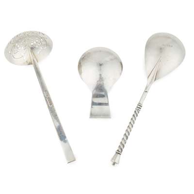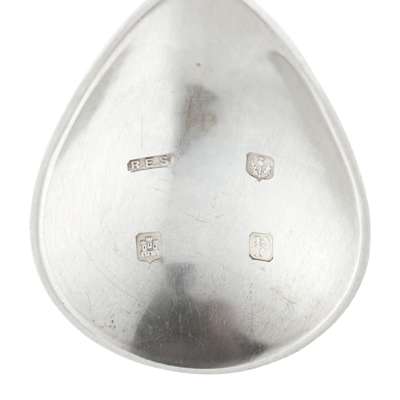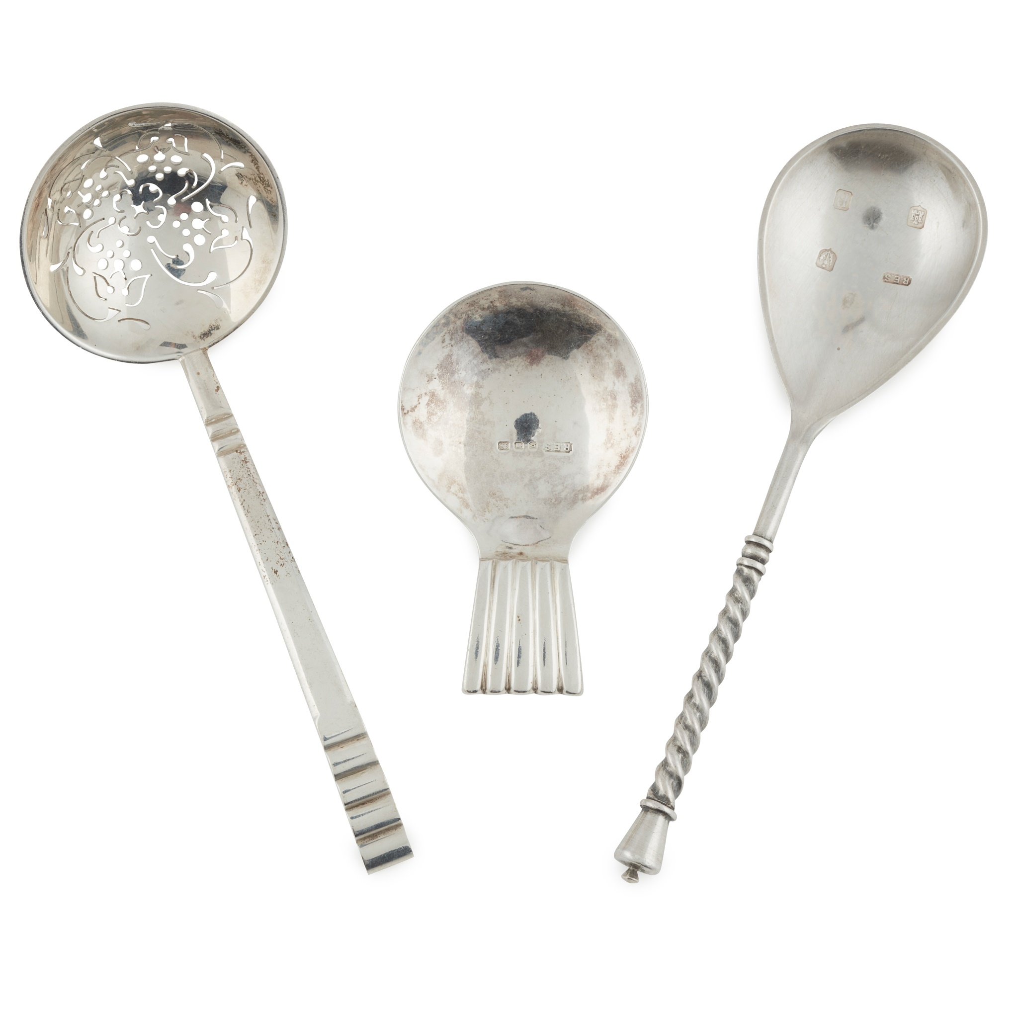 Robert Edgar Stone, Edinburgh 1970, with fig bowl and twisted stem, signed to the reverse of the bowl; together with a sugar sifter, Robert Edgar Stone, Glasgow 1938 and a caddy spoon, Robert Edgar Stone, London 1936