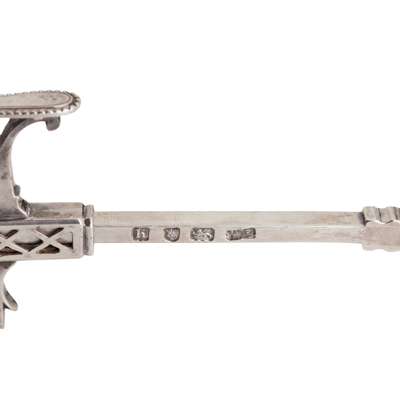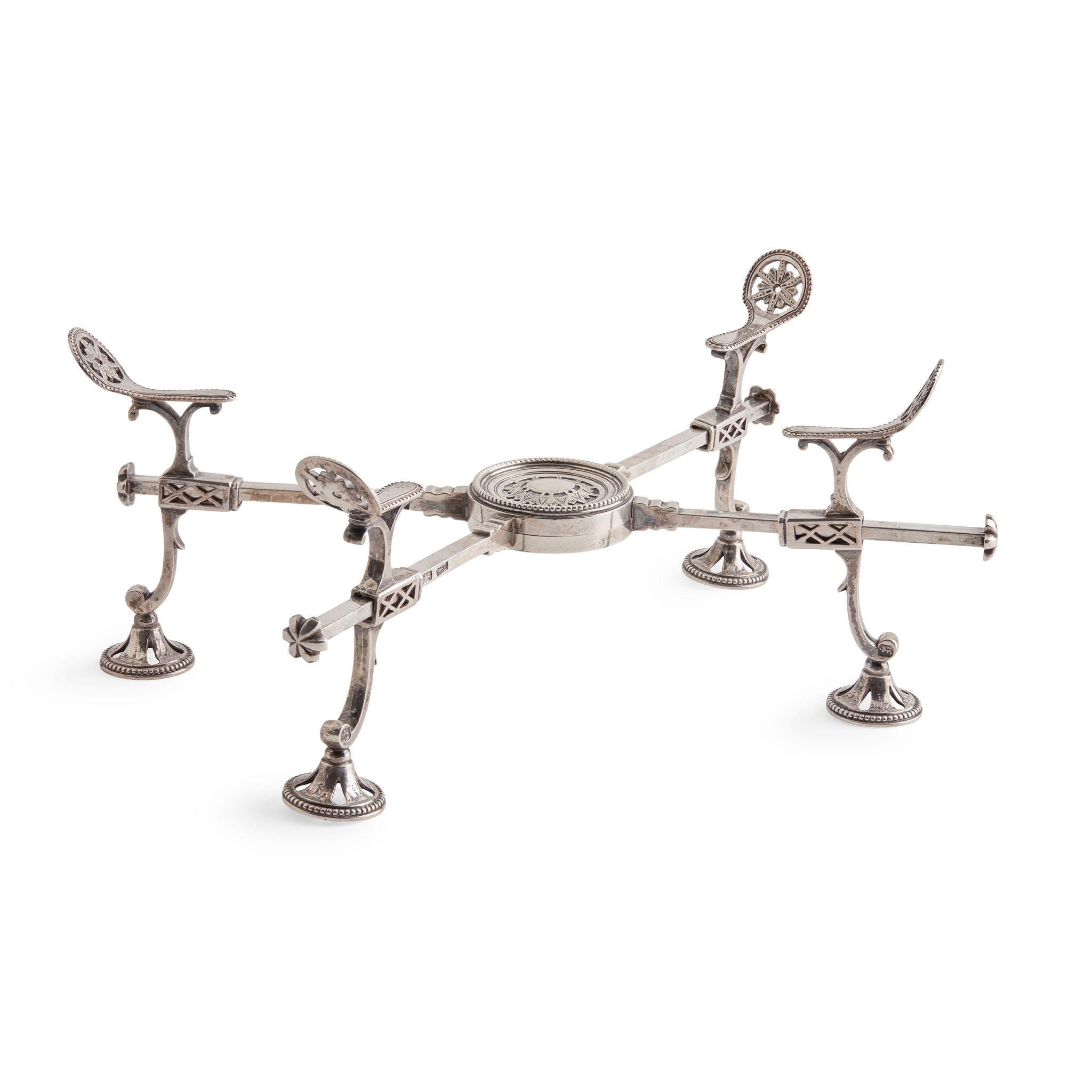 William Plummer, London 1783, of traditional form with four radiating arms and adjustable slides, beaded and well pierced detail throughout, the disc feet similarly decorated