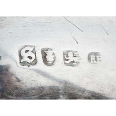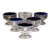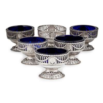 Robert Hennell, London 1773, each of oval outline with pierced sides and swag details to an oval cartouch with engraved crest, the oval foot of domed pierced form, five with blue glass liners