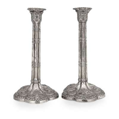 William Cafe, London 1768, each of cinquefoil outline, the moulded stems with acanthus clasped terminals and removable gadrooned sconces, engraved crest, the base with similar acanthus decoration, crest and motto engraved to a stylised cartouche, inset mahogany bases (loaded)