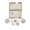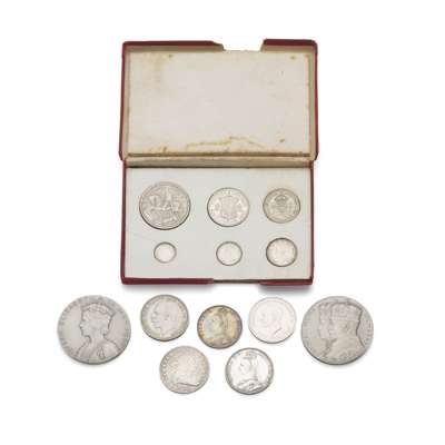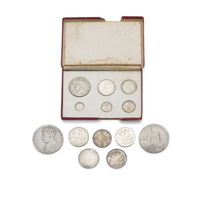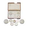 George VI coronation large medal, satin finish; George V 1910-1935 large jubilee medal, satin finish; part 1937 composite silver coin set; 1951 crown; 1935 proof crown; 1897 crown; 1887 double florin; USA 1799 draped bust dollar, worn