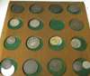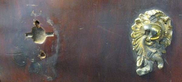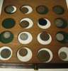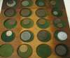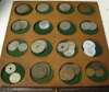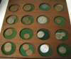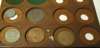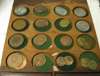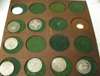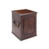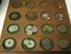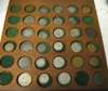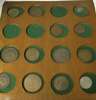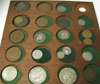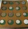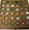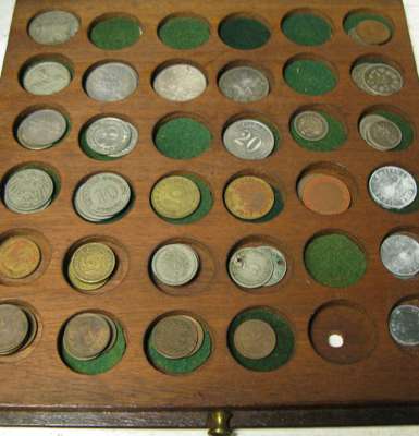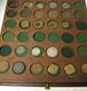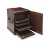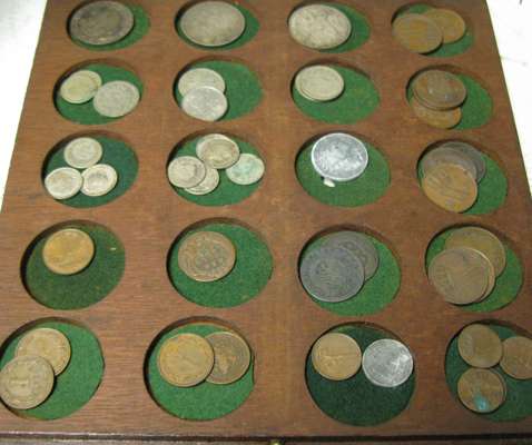 the single door cabinet with heavy gilt loop side handles, applied moulding to the single door, enclosing 24 sliding trays, partially filled with a mixture of coins to include; GB, bronze, copper and silver, Indian silver etc. Argentina, Scandinavian, etc.