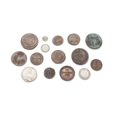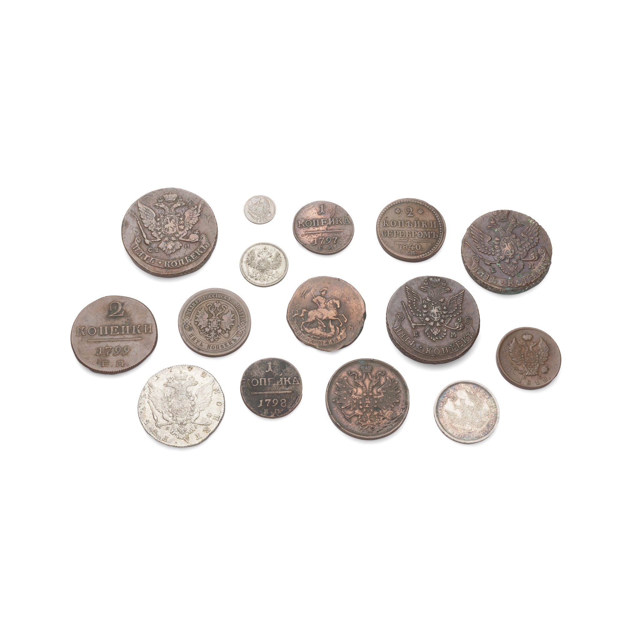 Catherine 1772 one rouble; 1855 HI Poltina Russian silver fifty kopeks; 1826 five kopeks; 1864, five kopeks; 1799, two kopeks; 1870 five kopeks; 1840, two kopeks; 1812, two kopeks; 1798 one kopek; 1797, one kopek; 1765 five kopeks; 1790 five kopeks; 1779 five kopeks