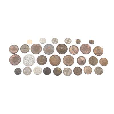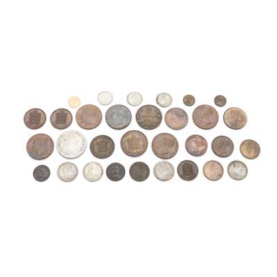 1/13 of a shilling x 4, all 1858; Guernsey eight doubles 1858, 1834, 1864; Guernsey 4 doubles 1858 x 3 1874 x 2; GB penny 1862, 1853, 1893; Greece, Ionian one book x 2 1834; GB halfpenny, 1853, 1854, 1860 x 2; two 18th century gambling tokens; George III 1797 quarter guinea, (very worn); GB six pence, 1758 x 3; GB shilling 1787 x 2, 1758 x 2, 1787, GB Crown Charles II 1676, Vicesimo octavo.