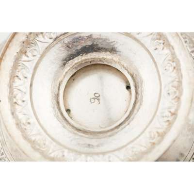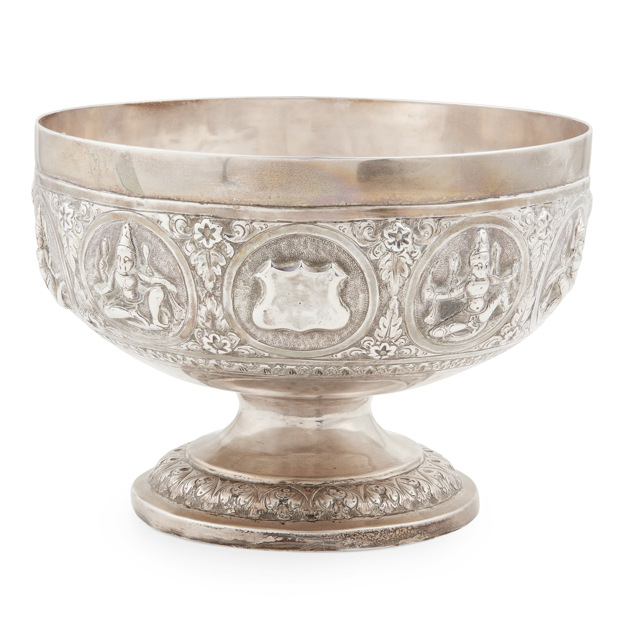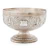 apparently unmarked, the hemi-spherical bowl with embossed depictions of Eastern deities in circular discs, vacant shield cartouche to two discs, all within floral scroll decoration, raised on a spreading stem to a circular foot with foliate decoration