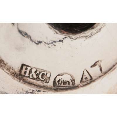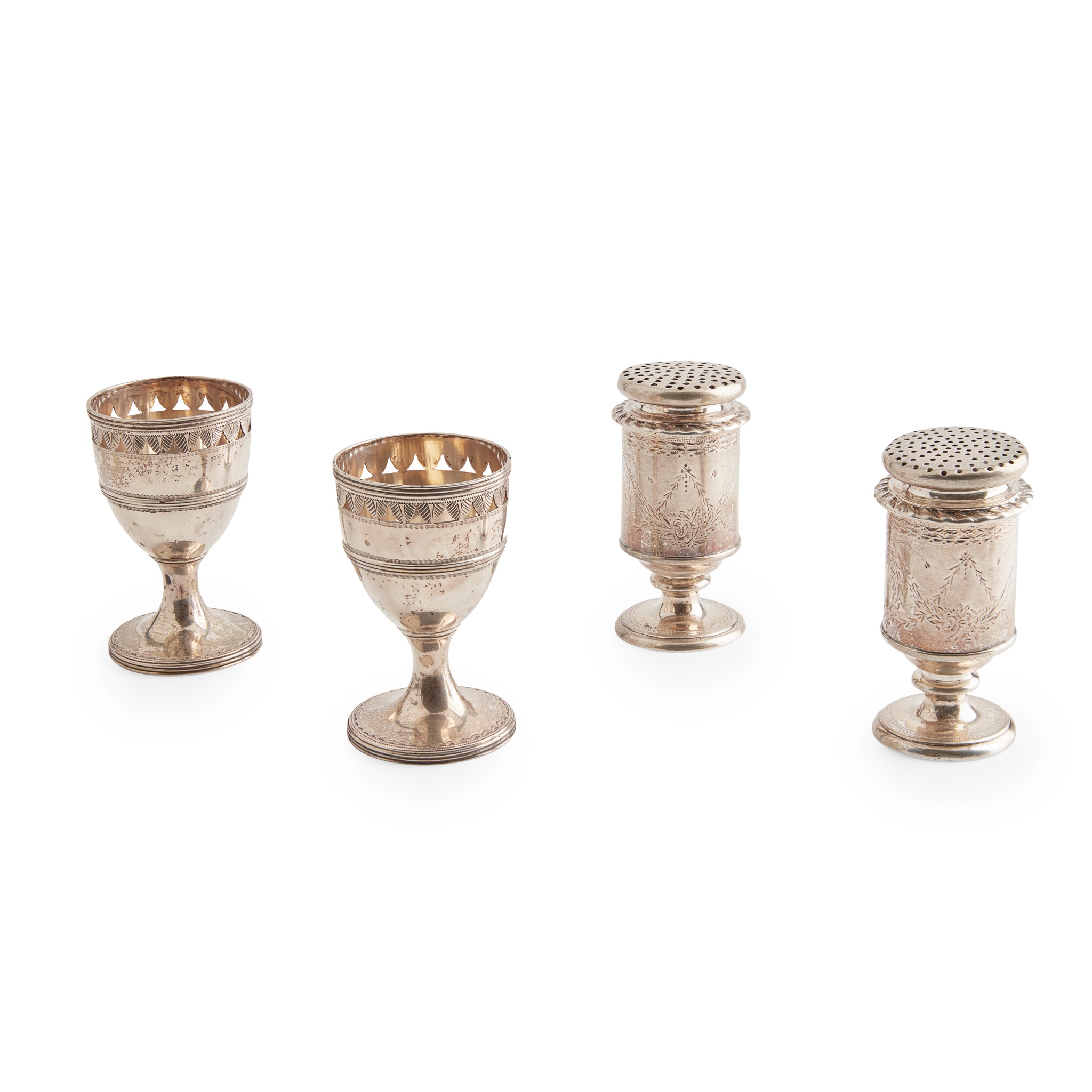 Hamilton & Co. Calcutta, marked H&Co, elephant, A, each of cylindrical form with engraved garland cartouche to body, the pull-off lid with flared gadrooned border, raised on a spreading circular foot; together with a pair of Georgian egg cups, Henry Chawner, London 1788, each with a pierced foliate border, waisted girdle with engraved crest to a spreading circular foot with engraved stylised border