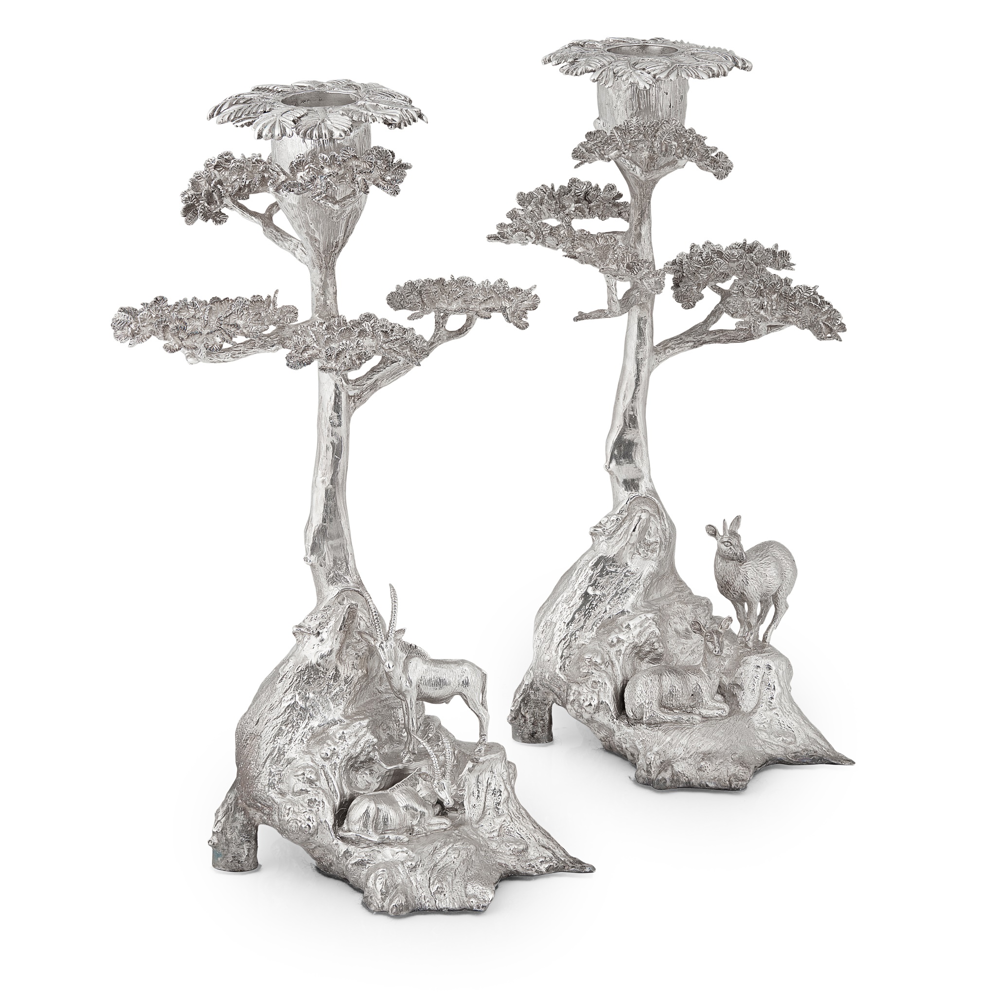 Patrick Mavros, Harare, with London date letter for 1999 and 2000 with commemorative millennium mark to one, each modelled naturalistically as a root tree with two Klipspringers to the base (loaded)