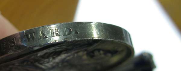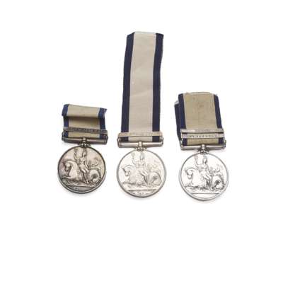 First, 1 bar, Hebrus with L’etoile, awarded THOs West, impressed; second, 2 bars, Lissa and Camperdown, awarded to Edward Edwards (renamed), engraved script; third 1 bar, Lion 15 July 1793, James Ward, impressed