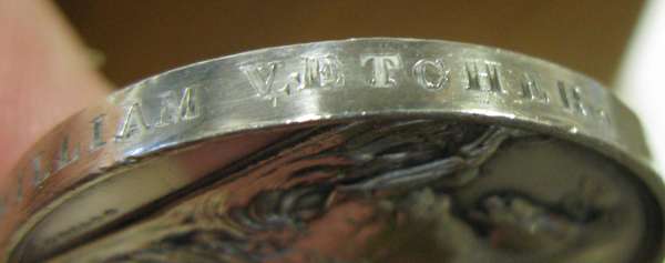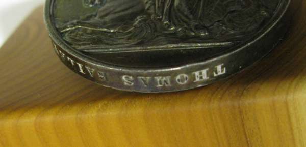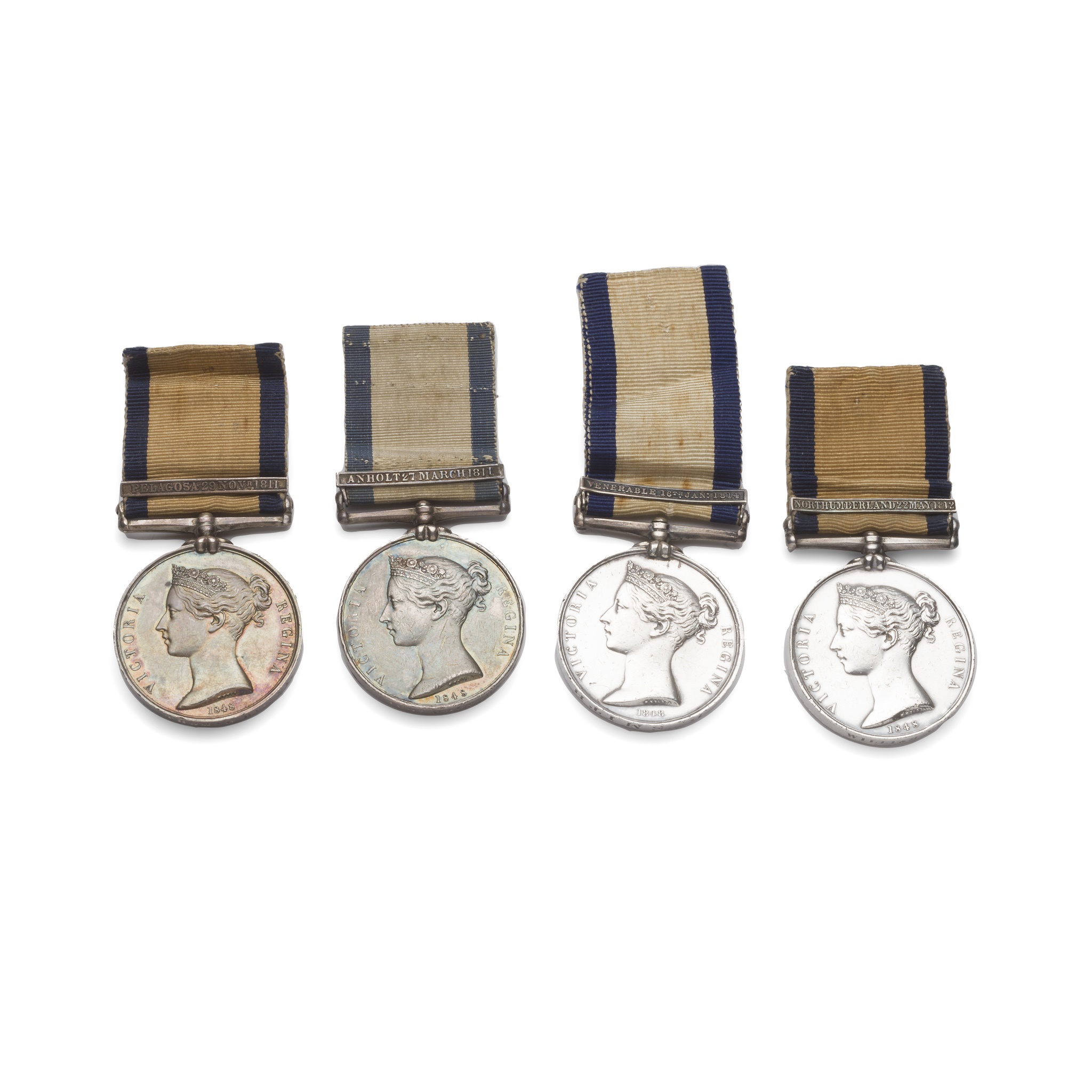 Venerable 16th Jan 1814, bar, awarded to P Smith, engraved (likely renamed); Pelagosa 29 Novr 1811, bar, awarded to Thomas Bailey, impressed; Northumberland 22 May 1812, bar, awarded to William Vetcher, impressed; Anholt 27 March 1811, bar, awarded to Nichs Walters, impressed, one of 40 bars issued