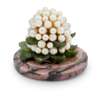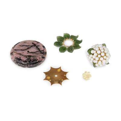 Stuart Devlin, London 1977, the circular rhodonite base with a floral bush formed of cultured pearls and carved jade petals on an 18ct gold disc