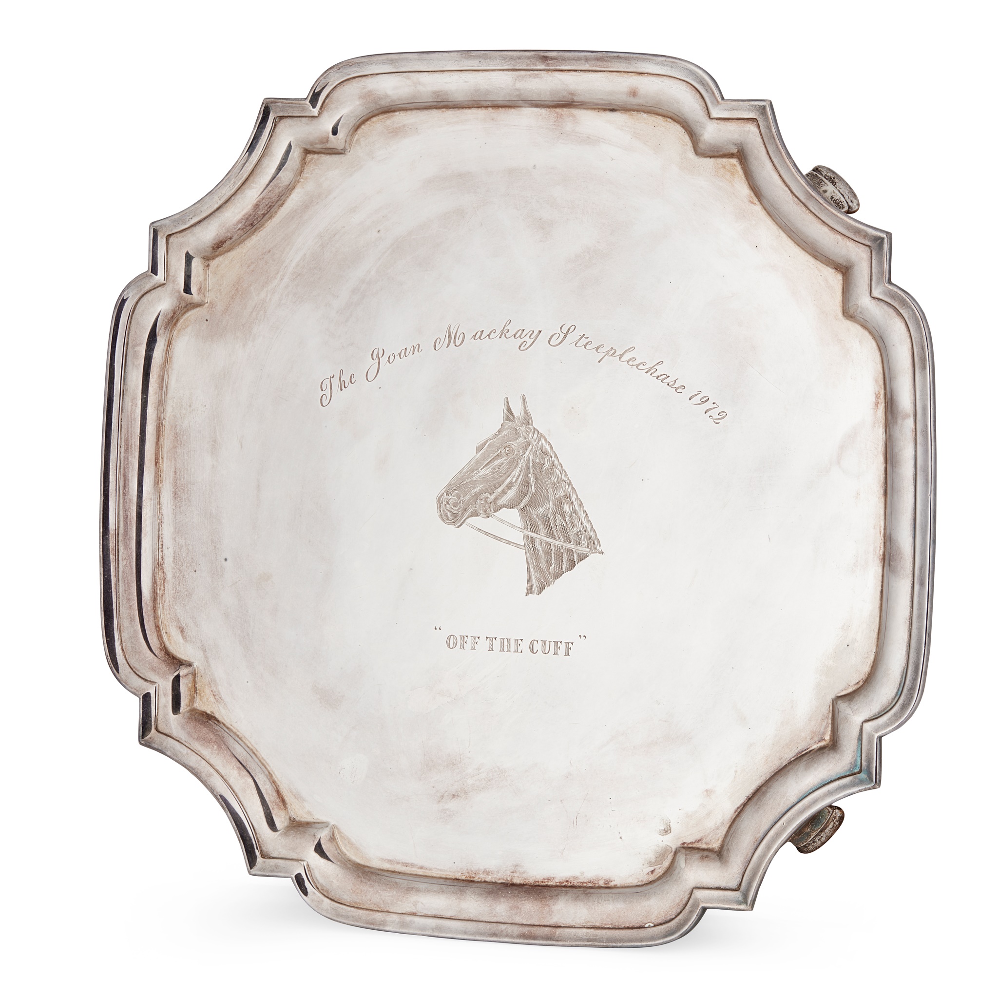 Wakely & Wheeler, London 1969, of square outline with moulded canted edges, with presentation engraving to centre, 'The Joan Mackay Steeplechase 1972' a depiction of a horse and 'off the cuff', raised on four bracket feet
