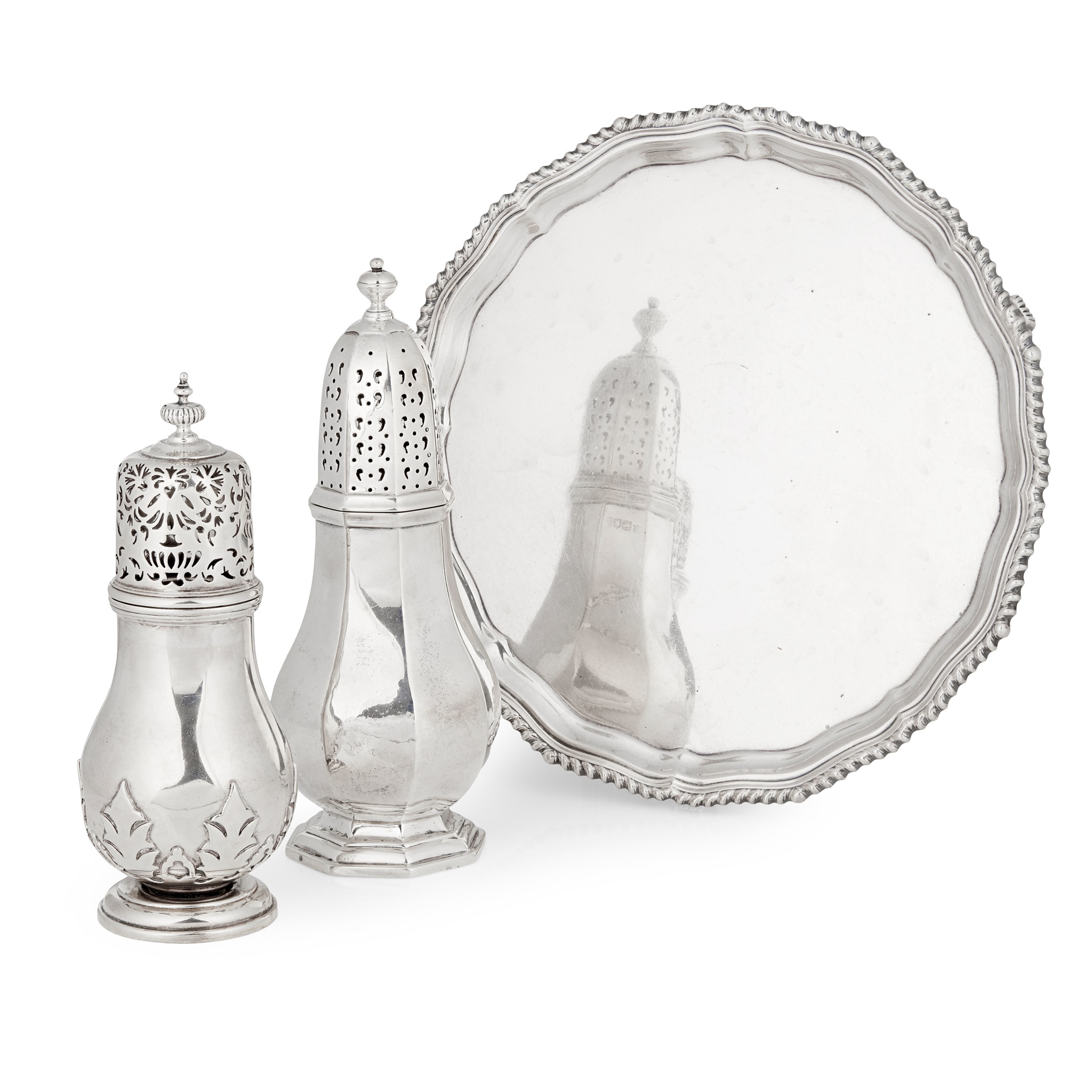 Adie Bros, Birmingham 1938, of circular outline, gadrooned border, raised on three scroll feet; together with a caster, Alexander Clark & Co. Ltd., Birmingham 1931, of baluster form, with cut-card detail to body, the pierced pull-off lid with knopped finial and another, Thomas Bradbury & Sons, London 1904, of octagonal outline