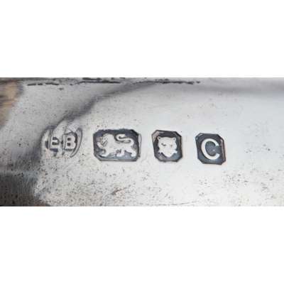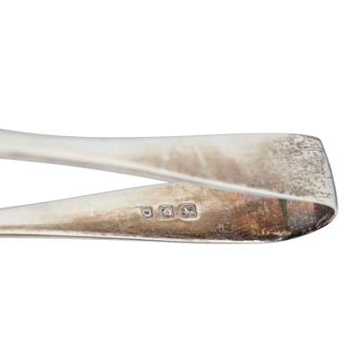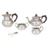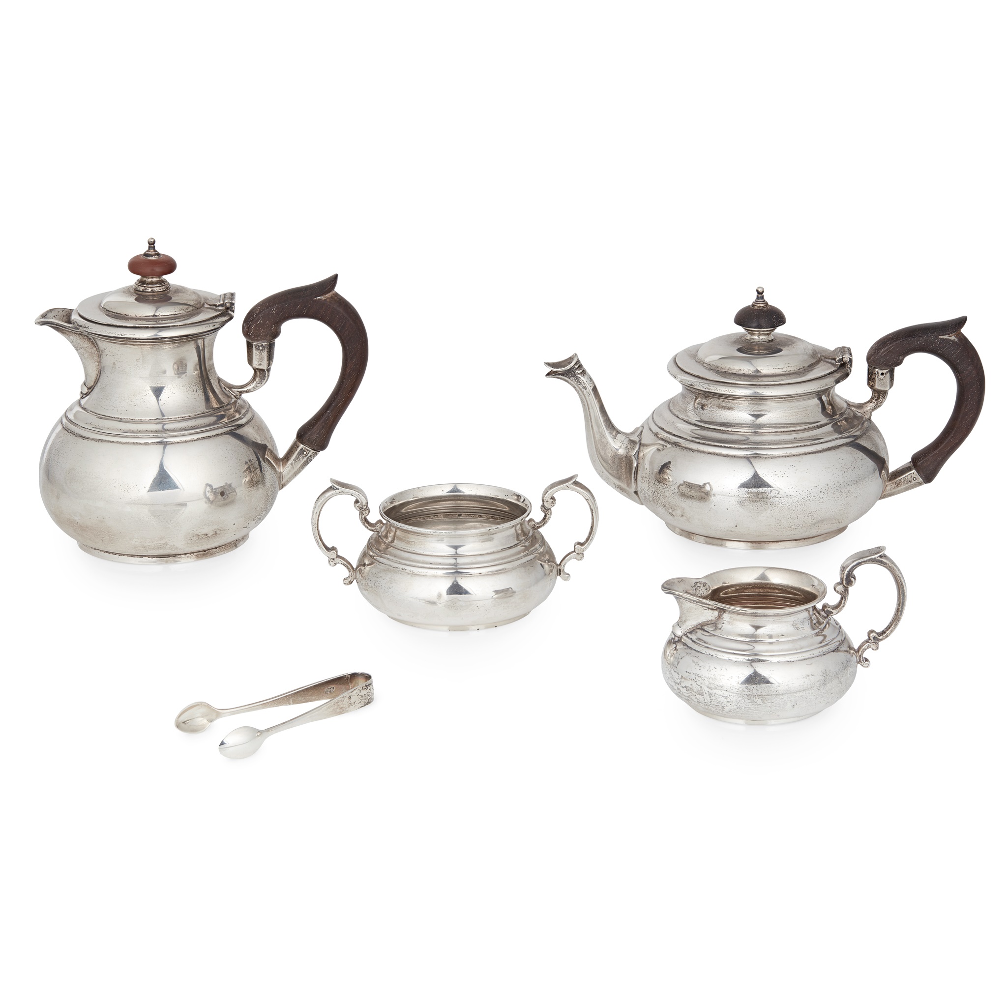 The Barnards, London 1938, retailed by Rattray of Dundee, comprising waterpot, teapot, sugar basin and milk jug, all of globular baluster form, with a threaded waist, S-scroll handles, raised on a circular foot; together with an associated pair of tongs