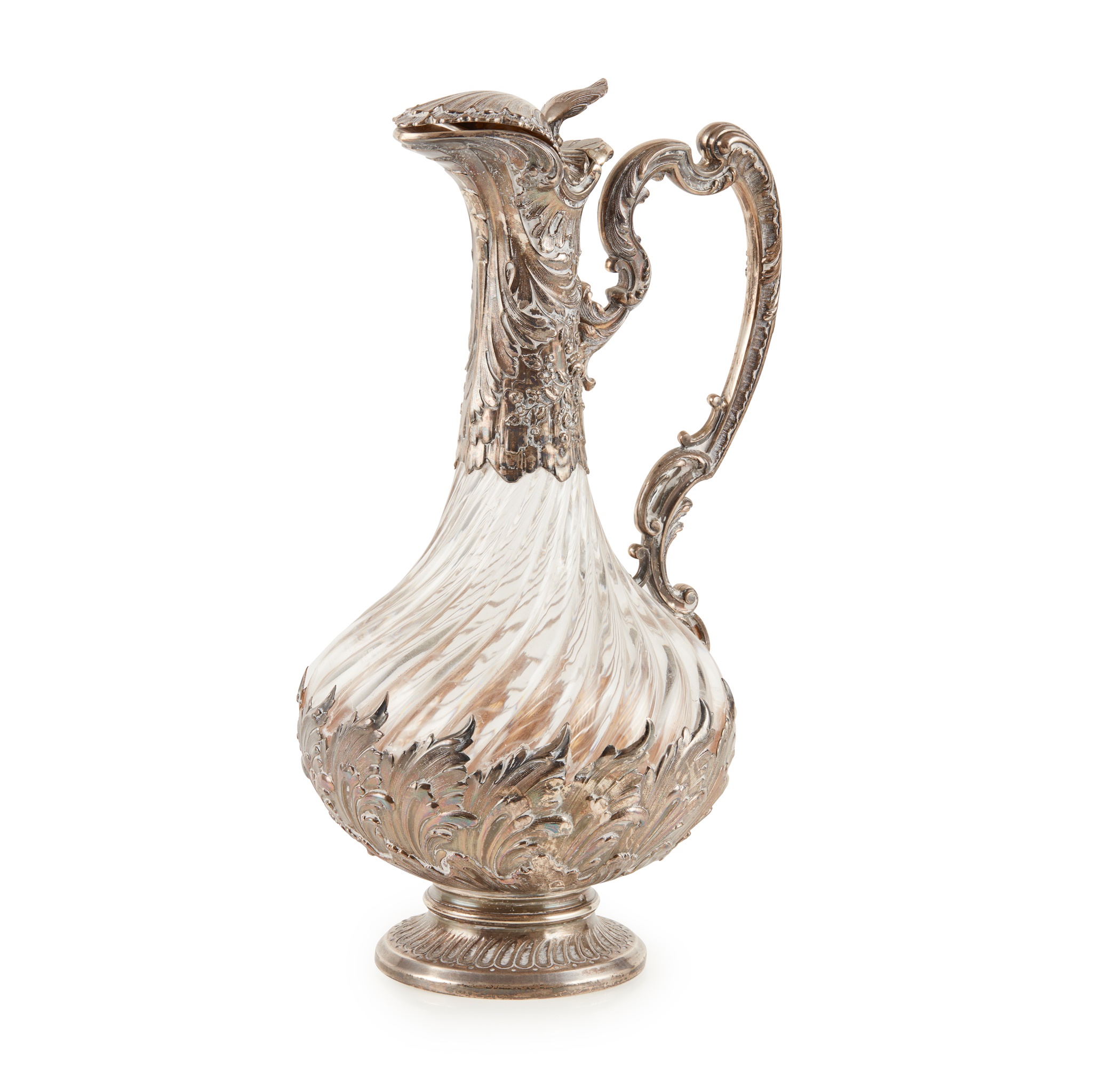 control marks for 800 standard to neck, L&P maker's mark to base, of baluster outline, the moulded glass of twisted ribbed form, the applied mount to neck with embossed floral and foliate detail, the hinged lid formed as a scallop shell, the S-scroll handle with similar foliate and floral decoration, applied silver acanthus foliate sprays to lower body to a silver circular foot with fluted detail