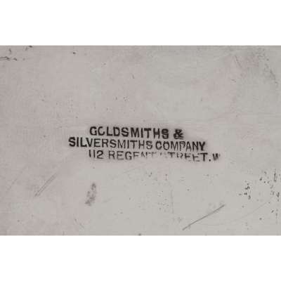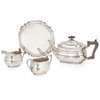 Goldsmiths & Silversmiths Co Ltd, Sheffield 1919/1922, comprising a teapot, twin-handled sugar basin and a milk jug, all of ribbed oval outline, angular handles, raised on an oval foot; together with a waiter, Goldsmiths & Silversmiths Co Ltd, London 1922, with pie-crust border, raised on four scroll feet